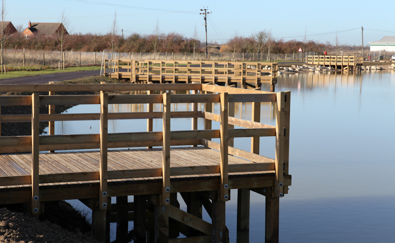 Four Fishing Platforms were designed, manufactured and installed at Wixams, Bedford by CTS as part of a much larger scheme to enhance a wildlife area around the lake. The softwood fishing platforms / jetties were manufactured in softwood and have Hi-Grip Excel non slip inserts on the deck boards.